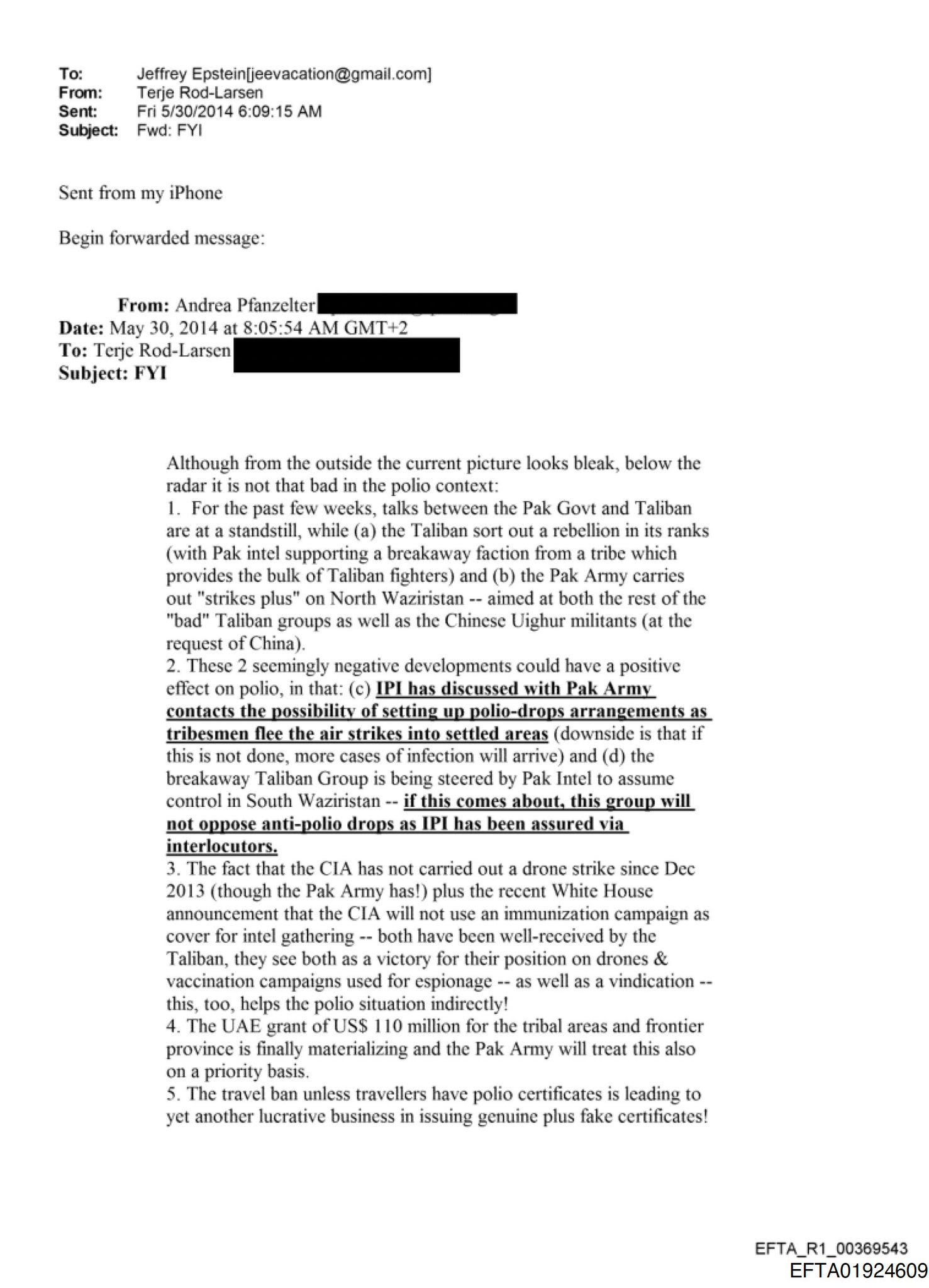 On May 30, 2014, a UN diplomat forwarded Jeffrey Epstein a real-time intelligence briefing on:
