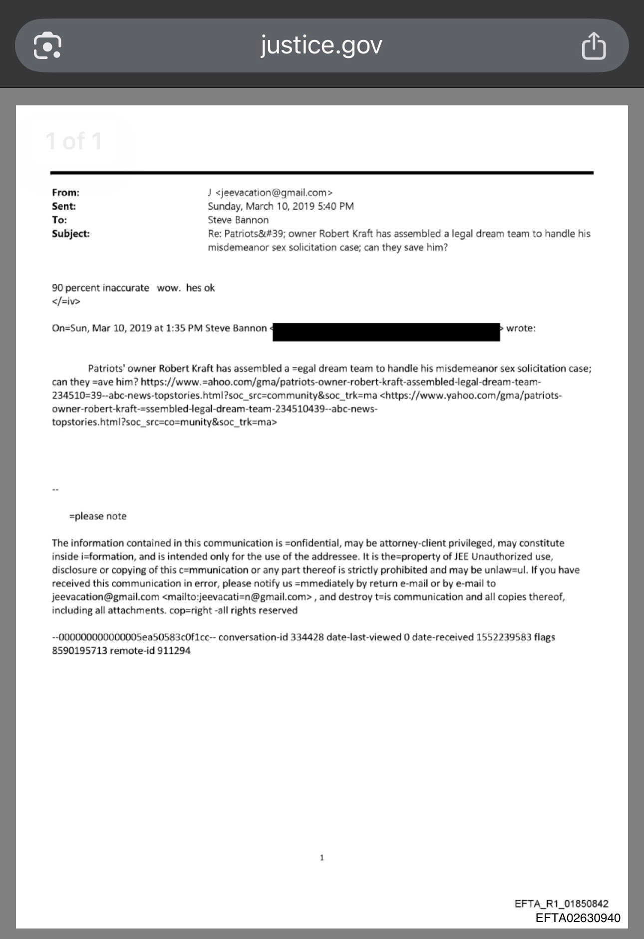 Breaking 🚨‼️ : We appear to have confirmation that Epstein not only helped coordinate Robert Kraft’s legal defense following his prostitution arrest in FL in 2019, but it appears to have been a crisis in Epstein-World as he emailed both Bannon & Ehud Barak about it! 👀