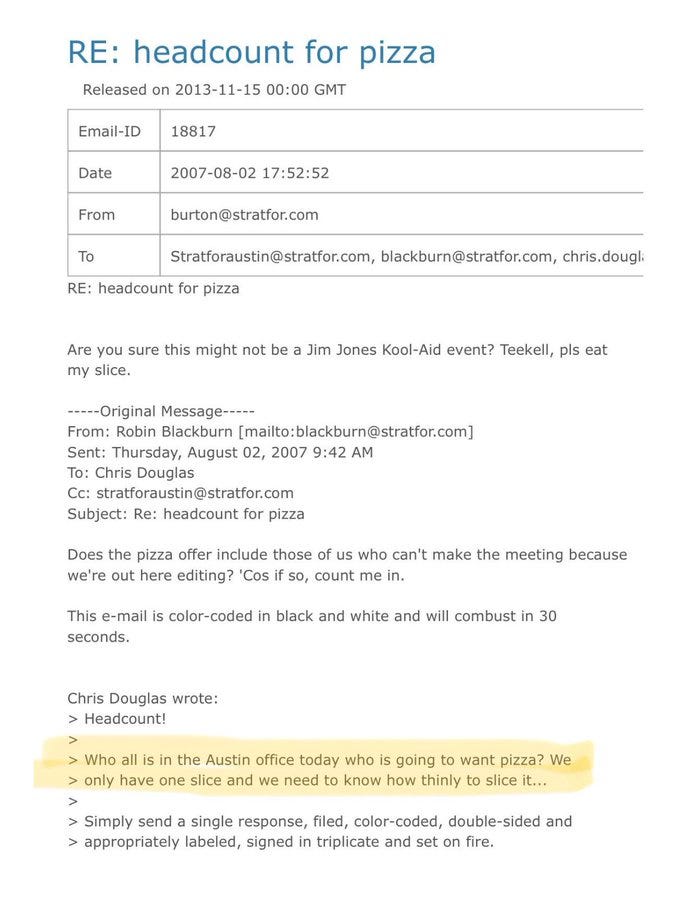 The phrase to slice or slicing pizza was also used in e-mails from the Global Intelligence Files released by Wikileaks in a context that clearly did not apply to food.