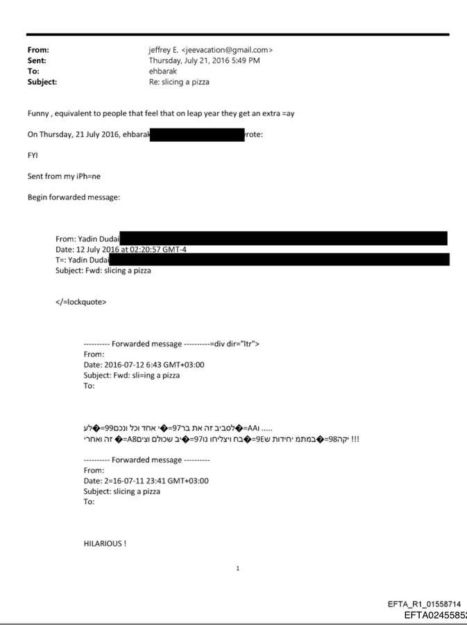 An e-mail most likely owned & run by former Israeli Prime Minister Ehud Barak about “slicing pizza” was sent to Jeffrey Epstein in July of 2016 that Epstein replied was “funny.”