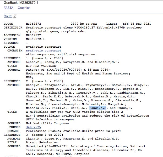 Click on MZ362874.1 and it points to a Moderna HIV vaccine patent filed March 13th, 2020 where Anthony Fauci is an author. The patent was published on Patent: US (PCT/US2020/022710)-A 13-MAR-2020