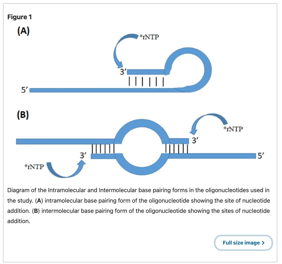 There is another more likely hypothesis given this unexpected sequence is from a Moderna patent. It could be a contaminant plasmid in Moderna’s IVT reaction which template switches and makes chimeric transcripts with two different vaccine targets? Template switching occurs when the T7 Polymerase is transcribing a template and then hops onto another template and makes chimeric RNA. This can happen in cis or in trans. Cis template switching is often called loopback template switching and occur more often when there are palindromic sequences on the RNA (Figure 1A). Trans Template switching occurs when two different DNAs have similar short sequences that terminal end of an RNA can decide to re-prime off two different templates (Figure 1B).