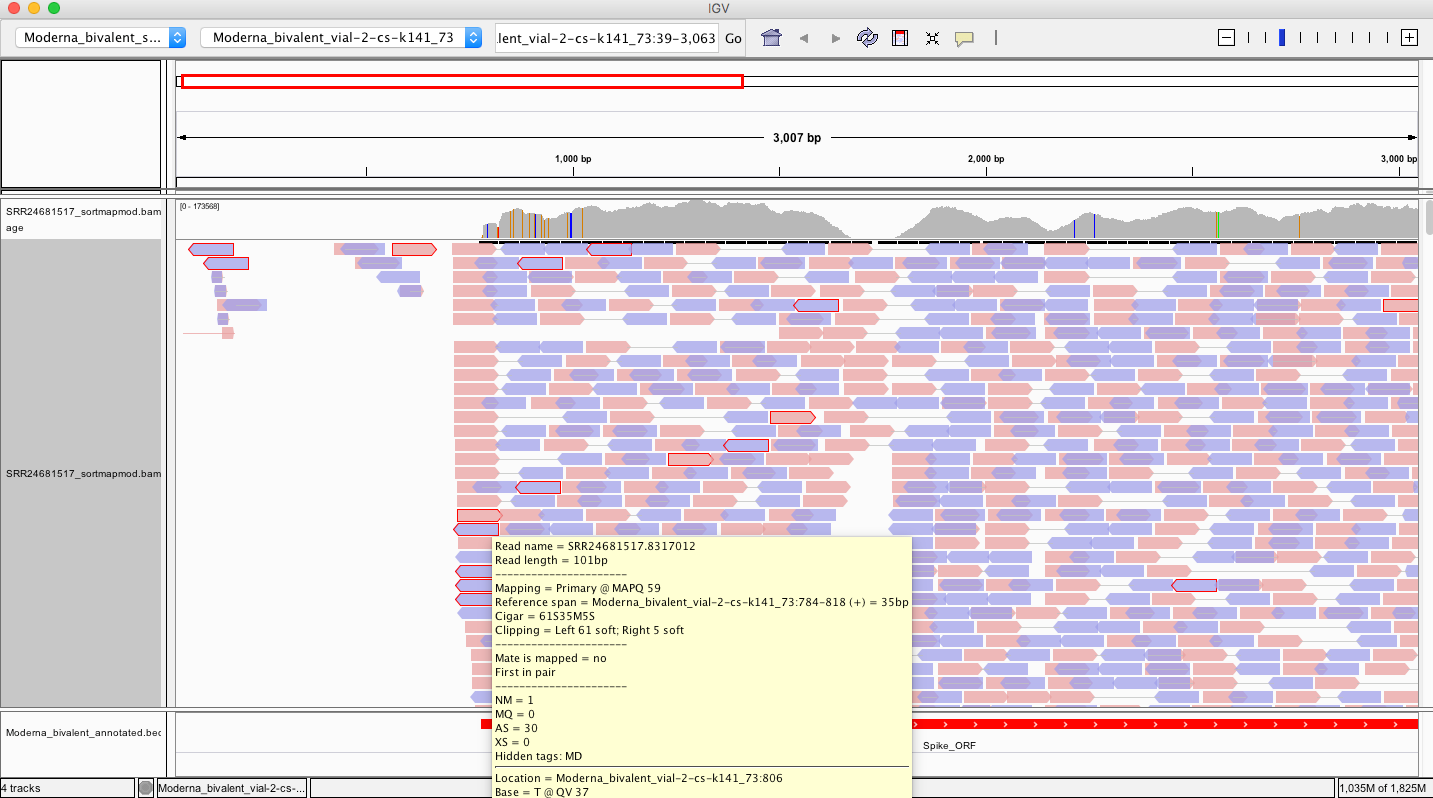 So if we want to find evidence of the 3’ ends of these vaccines having unexpected sequences, we must look at the 3’ end of the modRNA or the left side of that Spike_ORF in red (~790bp).