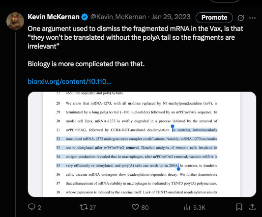 The chorus of vaxophiles and mutton minions on twitter were once again out in strong defense of such manufacturing slop because truncated mRNAs lacking a polyA tail will not be translated… at least according to their high school biology understanding of the translation process and lack of understanding of RNAi (RNA interference). They made the assumption that the smaller transcripts seen on Agilent were simply lacking polyA tails. Never assume when you have a sequencer.