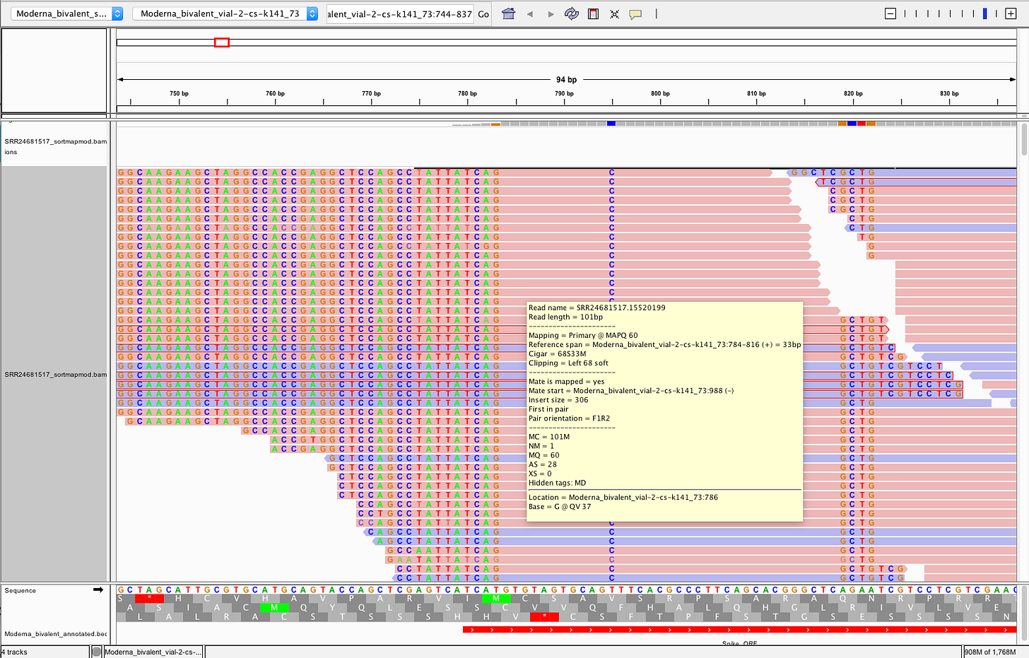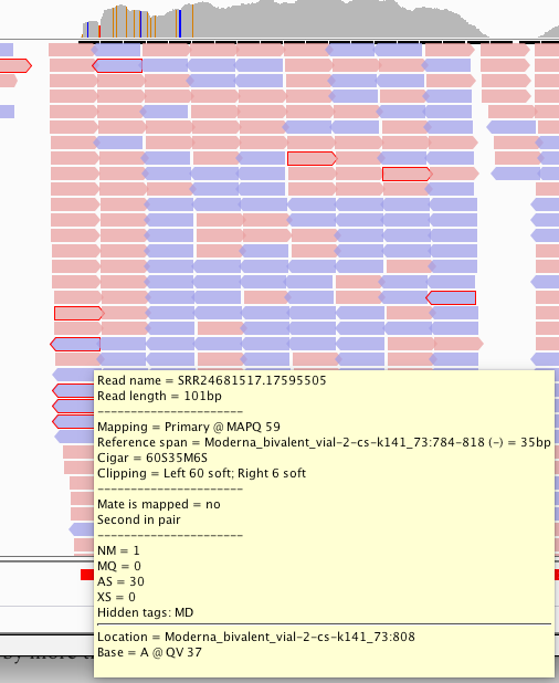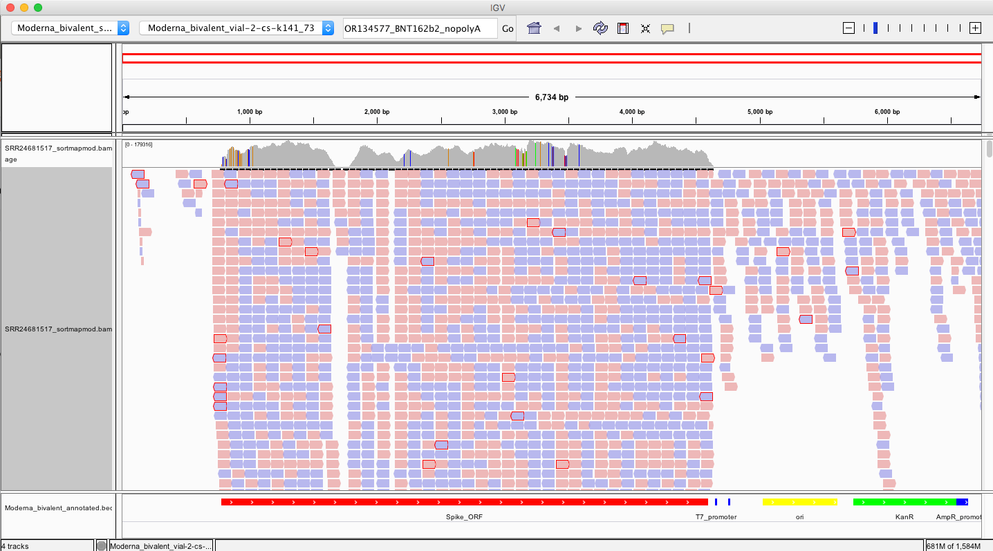 In fact, its supported by a truckload of reads. You’ll note the sequence where the reads disagree with the reference are overlaid in text on the pink and blue reads and do not match the Moderna mRNA1273 vaccine sequence on the bottom track.
