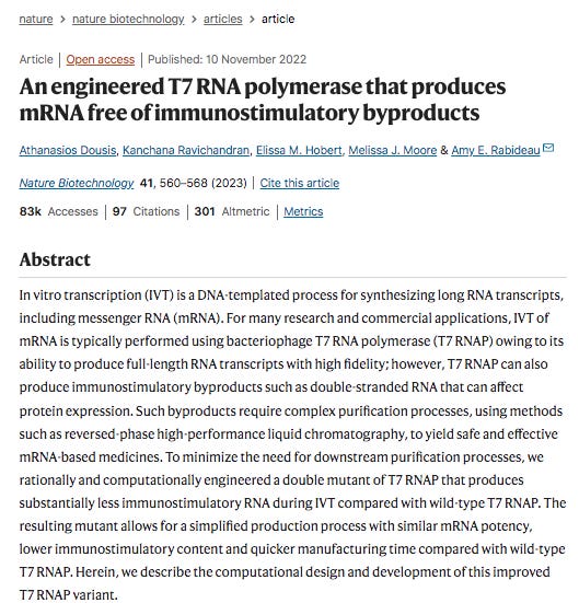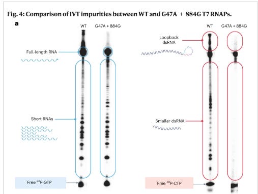 Moderna having the highest GC content in their spike codon optimization was notorious for template switching. They published a paper in 2023 showcasing their mutated T7 polymerase designed to eliminate this artifact. In doing so they lifted the veil on how much of this template switching their normal IVT process generated. See Figure 4 below. Those wildtype (WT) smears are all template switches. The mutated polymerase eliminates this. This is the source of the mess in BlotGate. The Poor RIN numbers and smeary gels; those are template switch artifacts. I just never expected to see another Moderna HIV sequence with Anthony Fauci’s name on it, in the C19 vaccines!