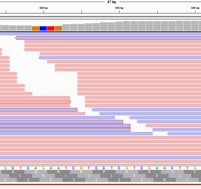 The reads on that 3’end boundary that are outlined in red are broken paired end reads. That means one 101bp read partially or fully maps to spike and the other read does not. Often times these spike reads are Soft-Clipped… meaning one part of the 101bp read maps to spike and the other part of the read is something else?