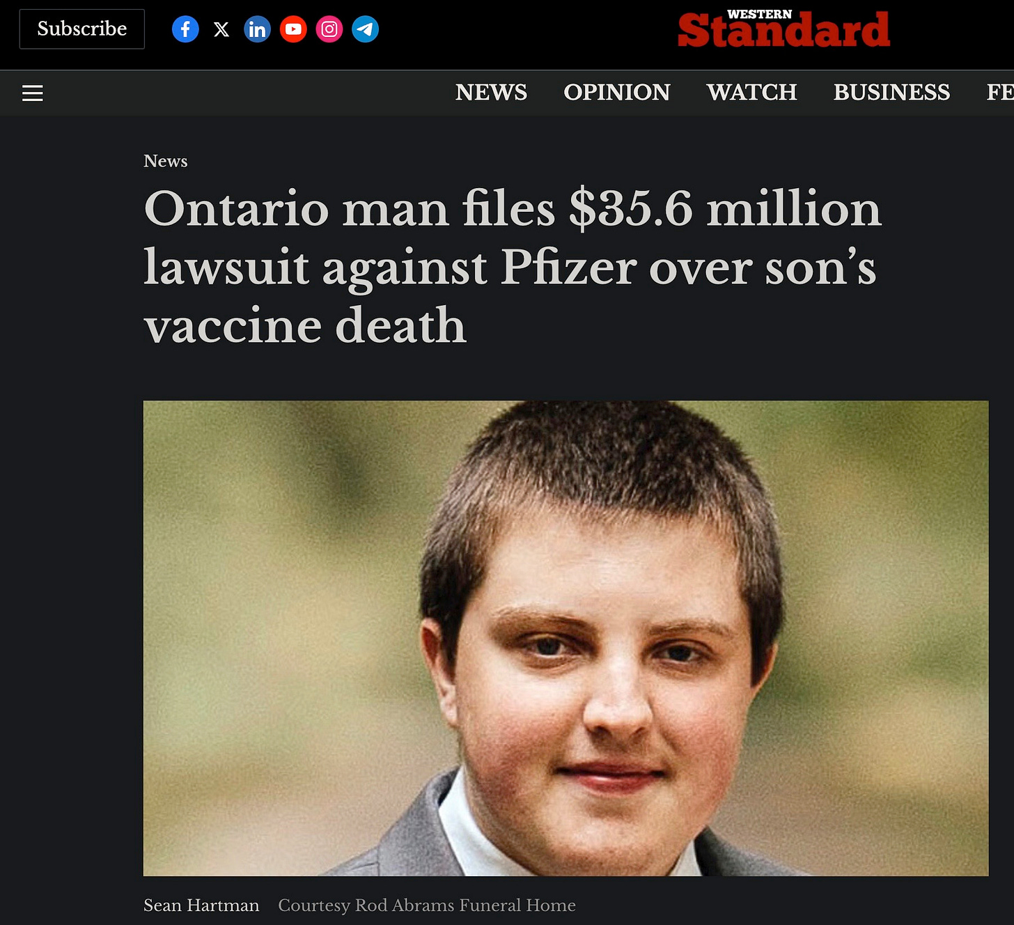 “On the morning of September 27, 2021, 33 days after receiving the Pfizer-BioNTech COVID-19 vaccination, Sean Hartman was found deceased in his bedroom by his mother,” said Sheikh Law lawyer Umar Sheikh in a court filing.
