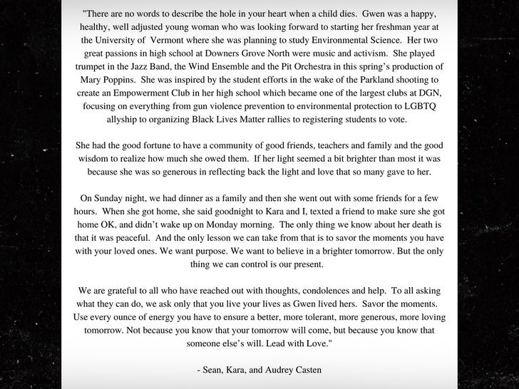 U.S. Rep. Sean Casten is opening up on the sudden death of his 17-year-old daughter, Gwen ... he says she went to bed Sunday night and never woke up.