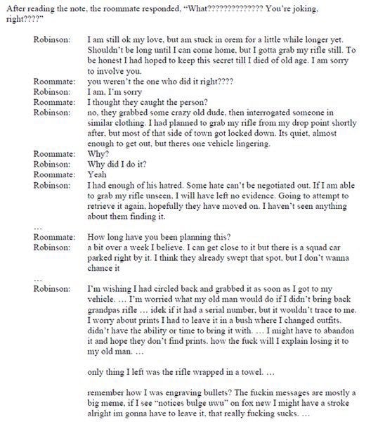 And here are the newly released text message transcripts between Robinson and his hormone-drugged fursuit trans roommate lover: