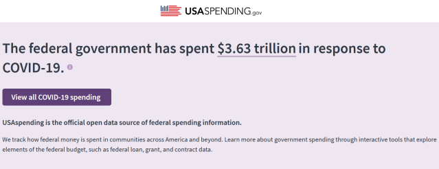 The Government of the United States has a website called ‘USA Spending‘, an official open data source of federal spending information. According to the site as of 12th April 2021 the US Government has spent a mind-blowing $3.63 trillion “in response to COVID-19”. But that’s not the only information on Covid that can be found within the site.