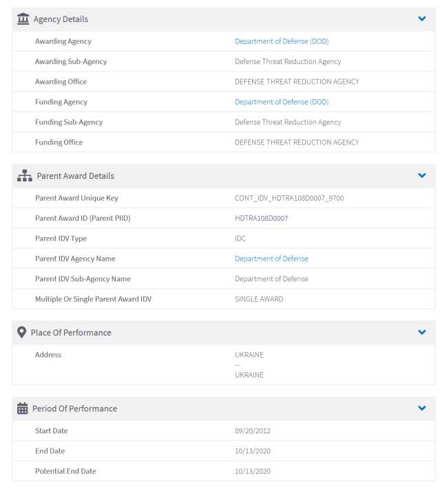 The contract details found on the ‘USA Spending’ site actually reveal that the specific DOD department that awarded the contact was the Defense Threat Reduction Agency (DTRA). The contract was awarded 20th September 2012, and concluded on 13th October 2020.