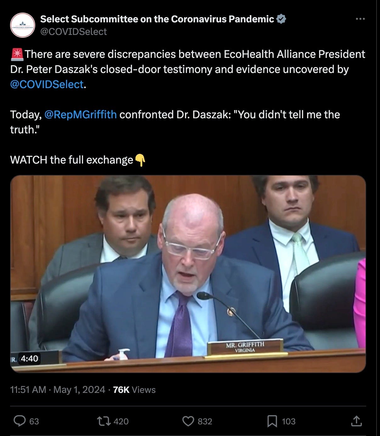 New Select Subcommittee Report Recommends EcoHealth Alliance President Debarred and Criminally Investigated, Exposes Failures in NIH Grant Procedures, House Committee on Oversight and Accountability, 1 May 2024
