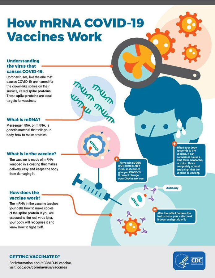 The CDC has described mRNA as the entity teaching cells how to make copies of the spike protein to enable protection when the real virus, with its own spike protein, attacks the body.
