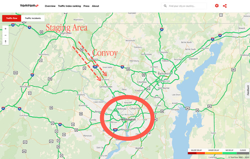 Data from geolocation technology company TomTom shows the convoy has left Hagerstown and is already clogging up miles of highway. Hagerstown is about a 70-mile drive from DC. The Daily Mail says the convoy could be up to 30 miles long.