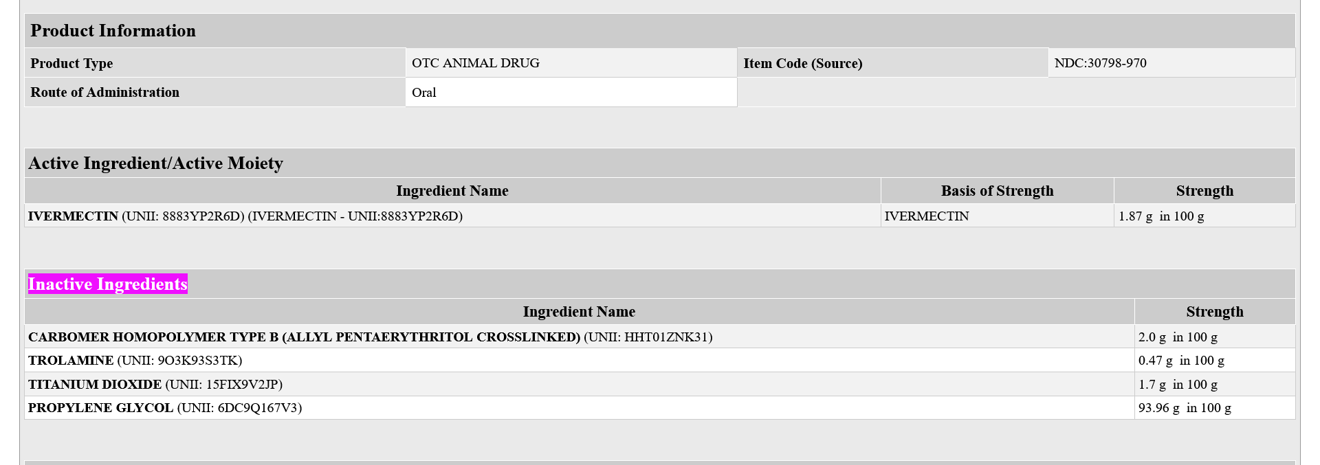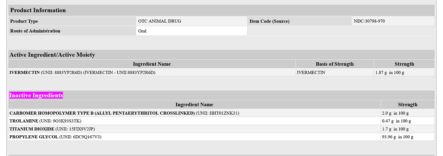 Tractor Supply sells an Ivermectin paste that is inferior to human-grade pharmaceutically pure Ivermectin tablets; in fact, here are the ingredients list for this offering:
