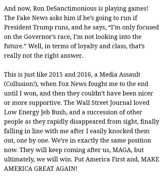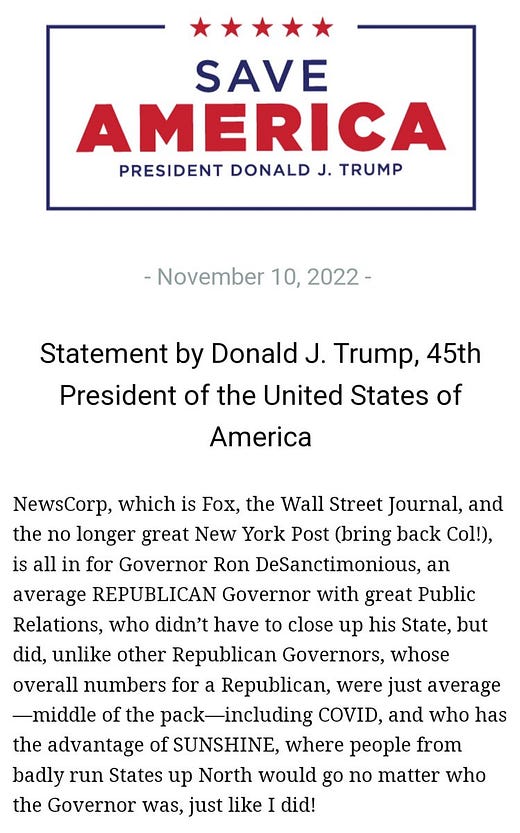 As the Red Wave was deliberately engineered to be a Red Trickle, and as Governor DeSantis telegraphs his 2024 presidential run, we are now witnessing the realtime meltdown of Trump’s ego.