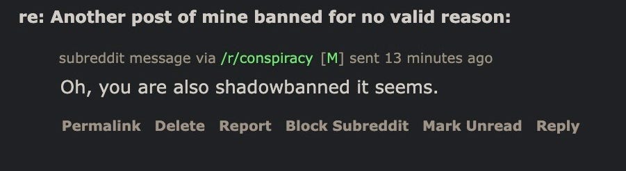 UPDATE: because there was no violation of TOS, reddit has un-shadowbanned my account, for now. At least they aren’t full-blown fascists like Twitter and FB, yet.