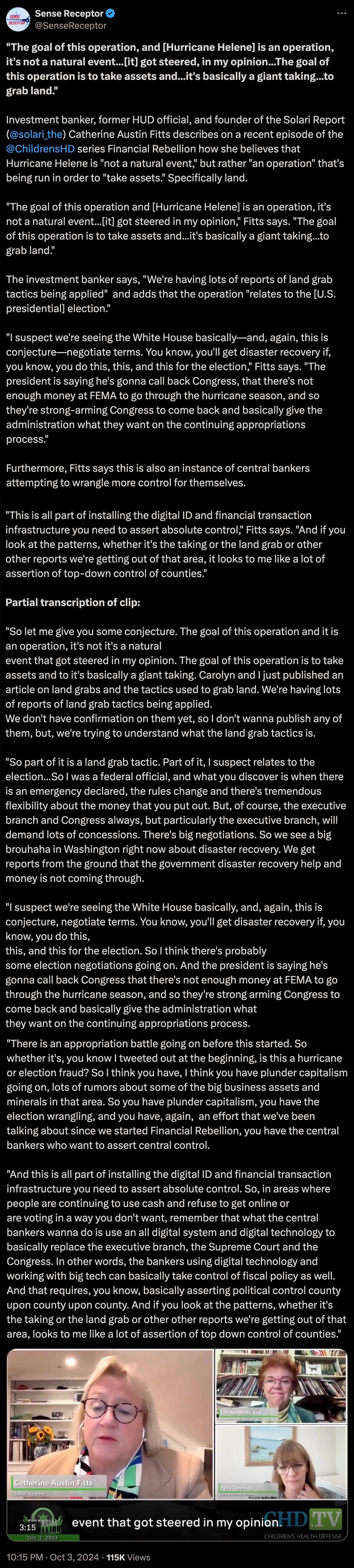 Additional color on exactly what is being perpetrated by PSYOP-HELENE, and why the “Harris-Biden” puppet regime is sabotaging search and rescue efforts: