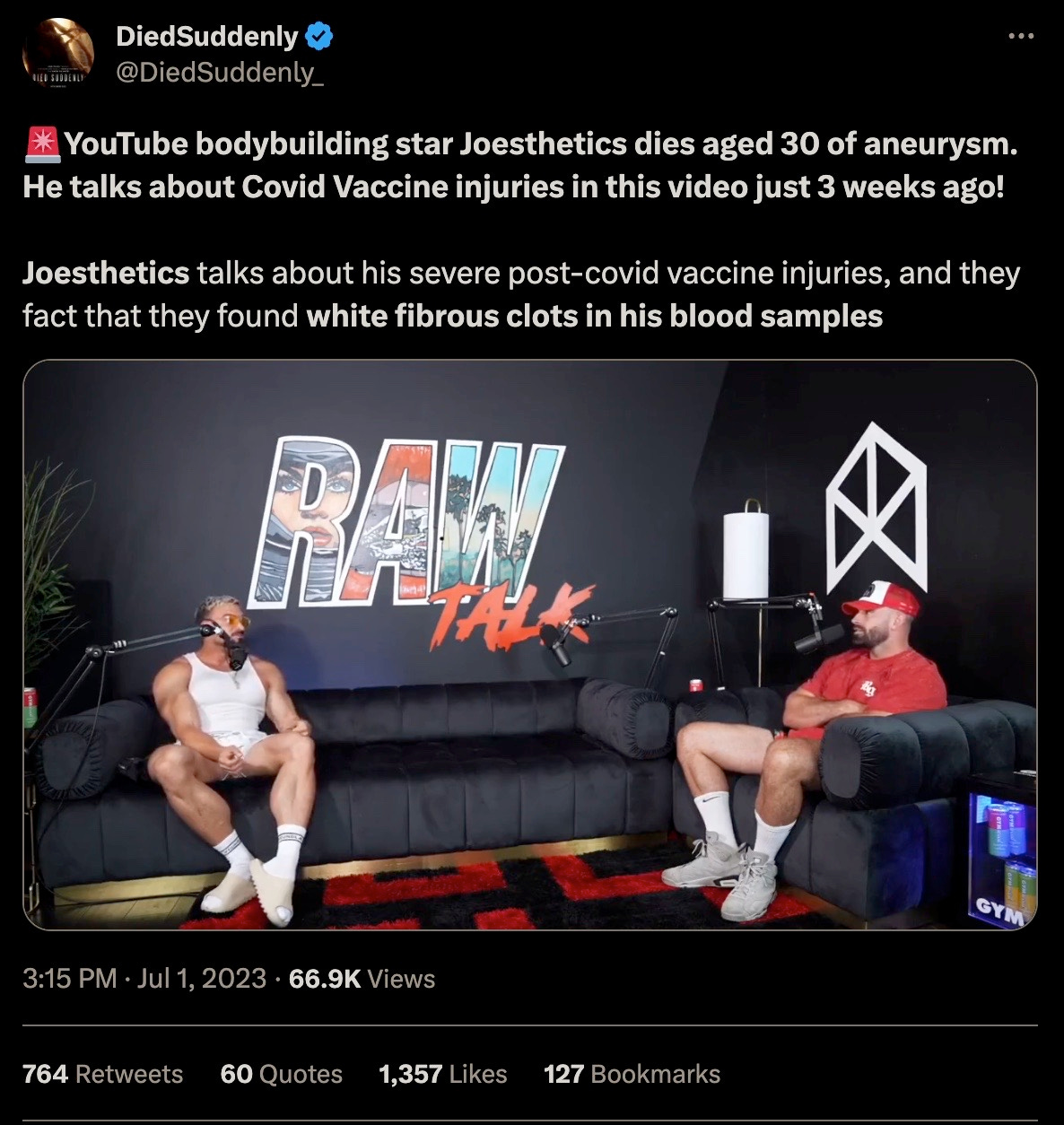 YouTube Bodybuilding Star Joesthetics Dies Aged 30 of Aneurysm, Admits He Was Peer Pressured Into Getting "Vaccine"