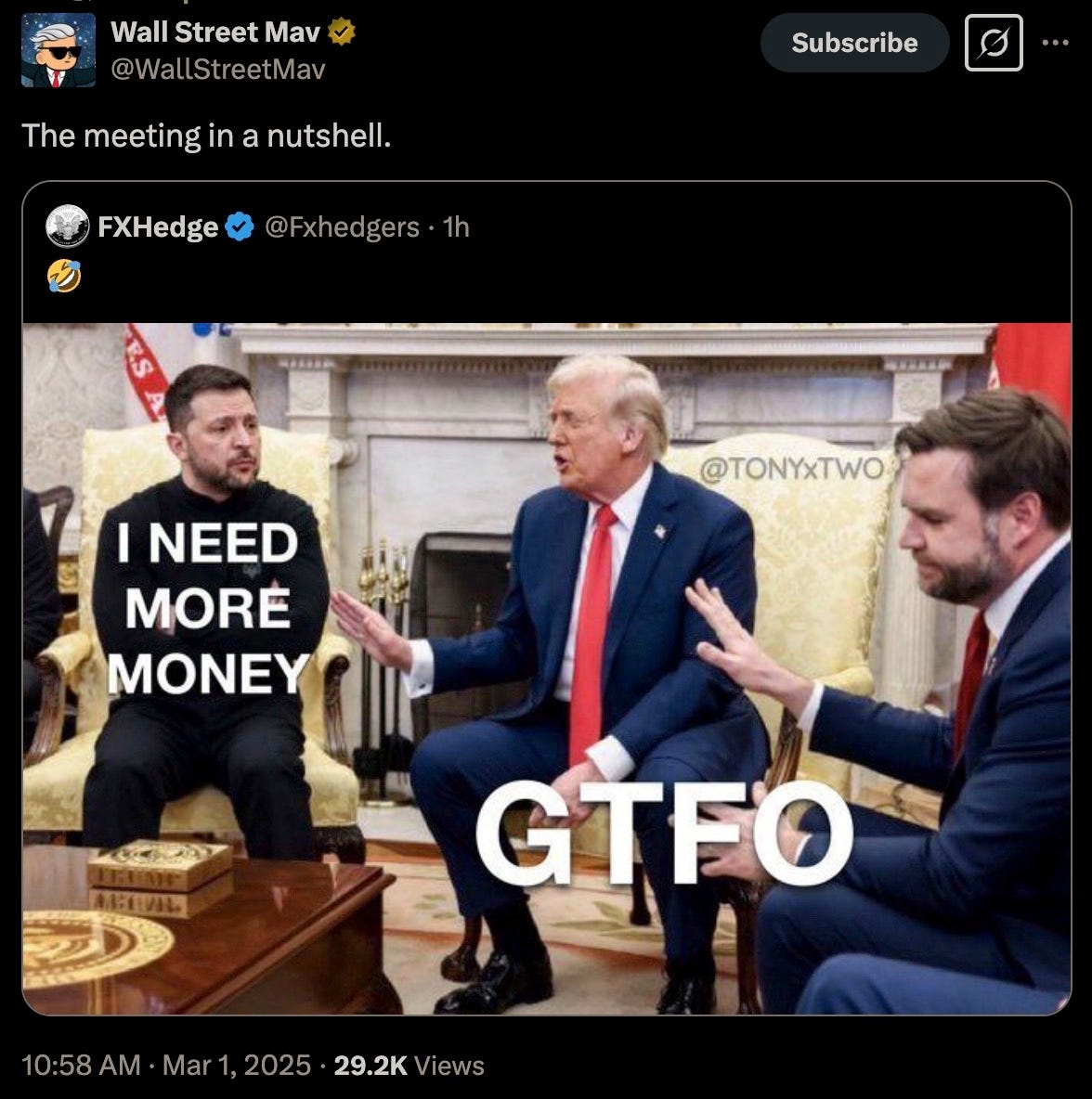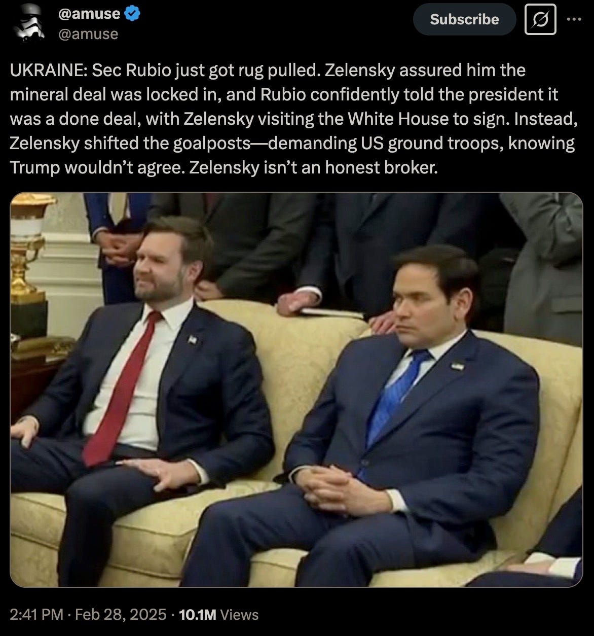 The whole purpose of yesterday’s meeting was twofold: to sign off on a mineral rights deal with Trump such that America would be paid back for the billions of dollars (theft via taxes) in Ukrainian “aid” (i.e. black ops money laundering right back to Washington, D.C. and the various Intelligence Industrial Complex partners-in-crime) and to commence the brokering of a ceasefire agreement.