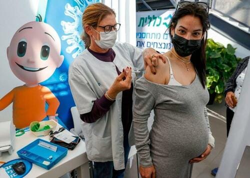 A health worker administers a dose of the Pfizer-BioNTech COVID-19 vaccine to a pregnant woman at Clalit Health Services, in Tel Aviv, Israel, on Jan. 23, 2021. (Jack Guez/AFP via Getty Images)